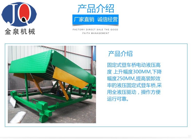 固定液壓登車橋是用于叉車與貨車之間的搭橋設(shè)備,方便裝卸貨物。液壓登車橋在現(xiàn)代物流現(xiàn)場(chǎng)已是一非常易見的結(jié)構(gòu) 形式。它是企業(yè)物流鏈的起點(diǎn)與終點(diǎn),是企業(yè)快速、安全周轉(zhuǎn)產(chǎn)品及貨物的一個(gè)裝卸貨操作平臺(tái)。 裝卸貨操作平臺(tái)的高度固定,但來往運(yùn)輸車廂的廂地高度不一,運(yùn)輸車輛與裝卸貨站臺(tái)之間總是形成一定的高度落差或間隙。造成搬運(yùn)叉車不能進(jìn)出運(yùn)輸車輛直接裝卸貨物。運(yùn)用登車橋提供可靠的連接。使搬運(yùn)叉車能夠安全、快速地進(jìn)出運(yùn)輸車輛進(jìn)行裝卸貨作業(yè)。