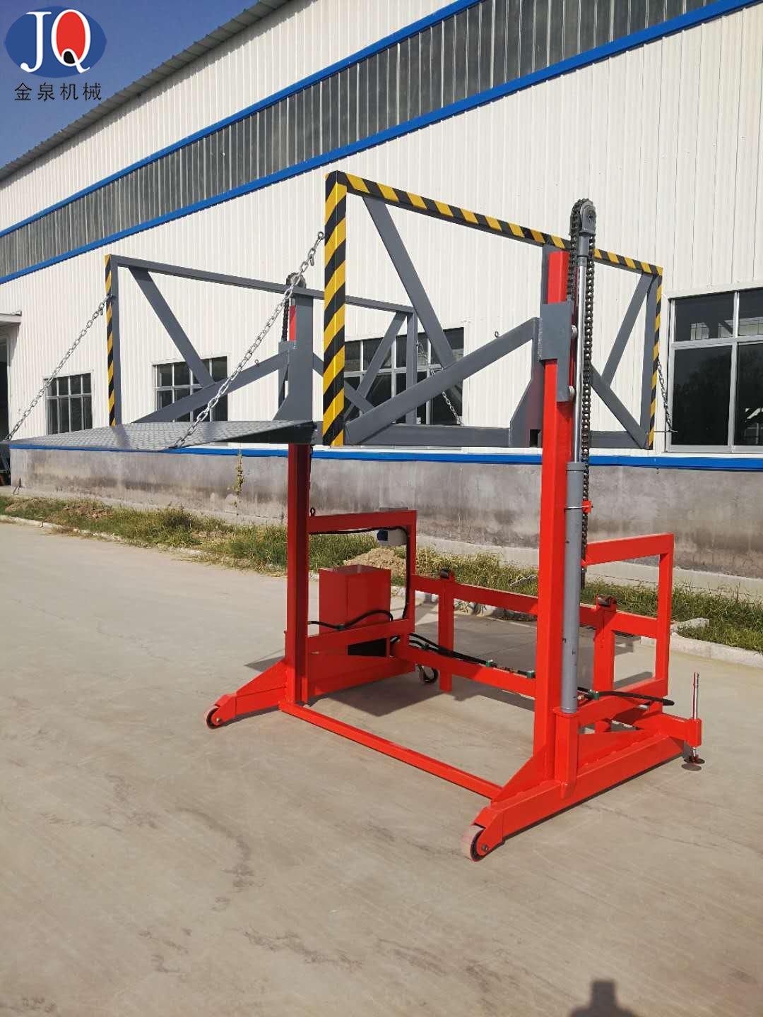 4. 在裝卸貨時(shí),貨物推上平臺(tái)后,應(yīng)將平臺(tái)前面的防護(hù)鏈條掛上,預(yù)防貨物滑落。